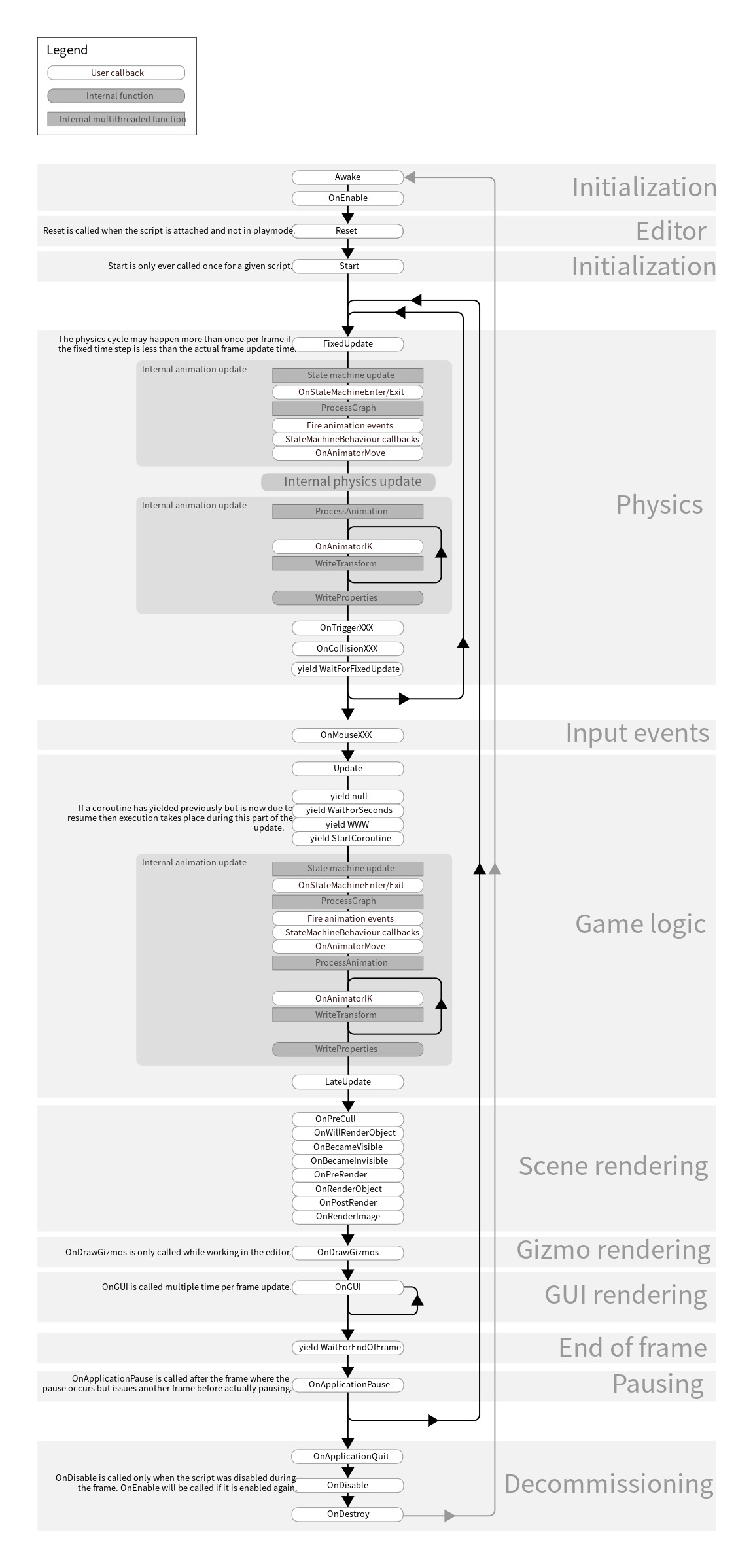 Unity 스크립트를 실행하면 사전에 지정한 순서대로 여러 개의 이벤트 함수가 실행됩니다. 이 페이지에서는 이러한 이벤트 함수를 소개하고 실행 시퀀스에 어떻게 포함되는지 설명합니다.