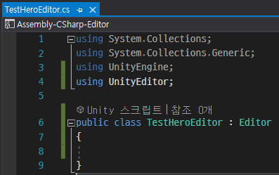 이 클래스는 Editor에서 파생되어야 합니다. CustomEditor 속성은 어떤 컴포넌트를 위한 에디터로 동작해야 하는지 Unity에 알립니다. CanEditMultipleObjects 속성은 사용자가 이 에디터로 여러 오브젝트를 선택하고 모두 동시에 변경할 수 있음을 Unity에 알립니다.
