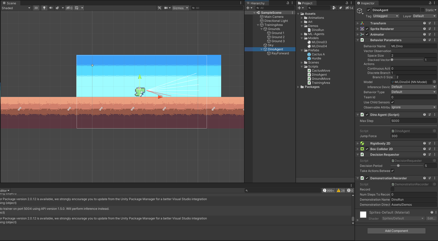 | 보상과 감점 if (collision.tag == "Reward") { Destroy(collision.gameObject); this.AddReward(1f); } ---------------------------------------------------------- if (collision.collider.CompareTag("Ground")) { this.AddReward(0.001f); } ---------------------------------------------------------- if (collision.collider.CompareTag("Cactus")) { Destroy(collision.gameObject); this.AddReward(-2f); this.dieAction(); this.EndEpisode(); } |